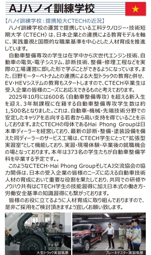 Trong số phát hành đầu năm 2026, AJ News dành nội dung riêng để cập nhật tình hình đào tạo tại CTECH – cơ sở đào tạo kỹ thuật trực thuộc hệ sinh thái Hải Phong Group. Bài viết nhấn mạnh quy mô hơn 1.500 sinh viên ngành bảo dưỡng ô tô hệ 3 năm, chương trình đào tạo thực hành sát thực tế doanh nghiệp, cũng như việc triển khai đào tạo các công nghệ mới như xe điện và xe hybrid tại CTECH.