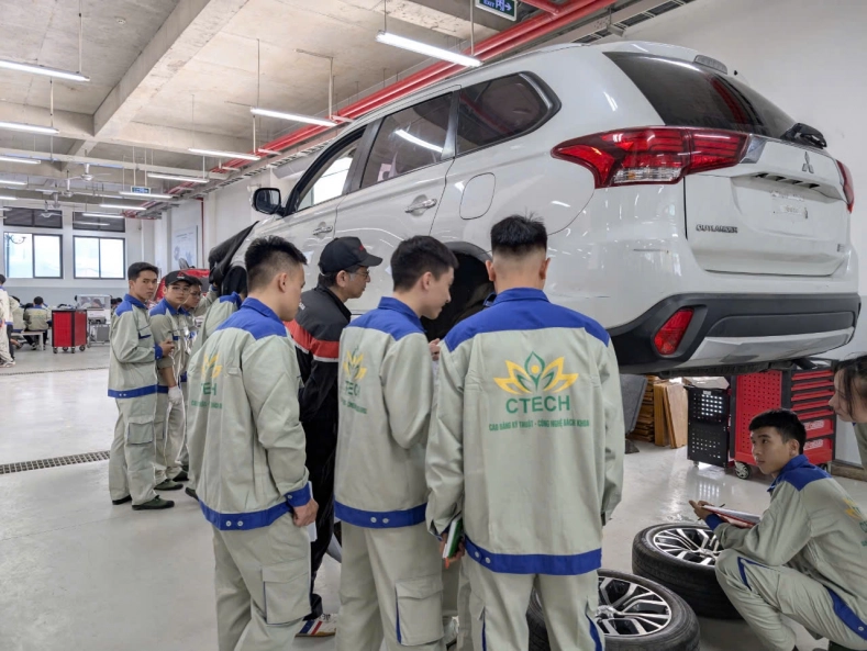 Sinh viên ngành Công nghệ Ô tô tại CTECH trong 1 tiết học thực hành với chuyên gia nước ngoài tại Xưởng thực hành Cơ khí & Công nghệ rộng hơn 2000m2.